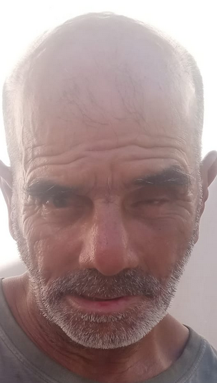 Tiene el ojo izquierdo entrecerrado. Viste de pantalón azul con reflectivo, canguro gris, gorro de visera negro y championes marrones