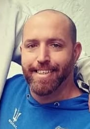 BARBA COLORADA, TATUAJE EN ANTEBRAZO IZQUIERDO (ROSTRO DE MASCULINO ADULTO). VISTE CANGURO AZUL, DEPORTIVO AZUL Y BOLSO NEGRO ADIDAS.