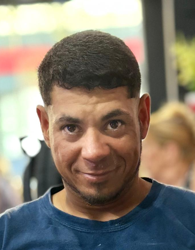 Cicatriz en codo izquierdo aprox 10cm, tatuaje antebrazo derecho (H con estrellas) Vestia: Camisa manga larga gris, rayas naranjas, bermuda cargo, championes negros con franja naranjas y grises.