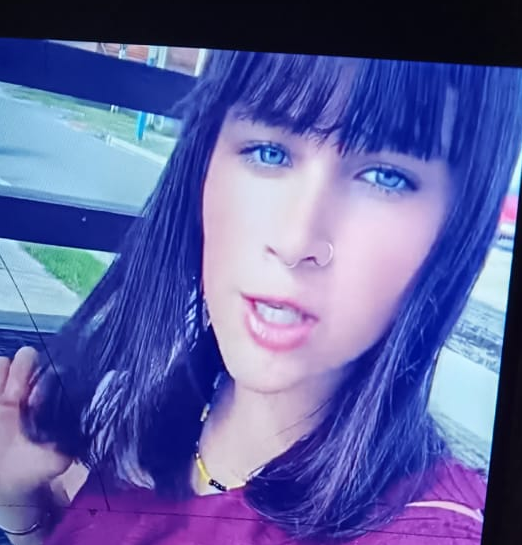 Pecas en el rostro, piercing en la nariz uno de cada lado. VESTIMENTA: Pantalón negro, Remera del liceo, campera blanca, championes negros con detalles en blanco, mochila de color celeste con adorno negros