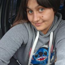 Ojo izquierdo desviado. Vestimenta: Uniforme de UTU y mochila roja.