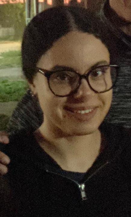 Posee un lunar en la cara. Usa lentes de receta. Vestía calza color negro, buzo canguro negro, blusa color celeste y cartera color negro con azas doradas.