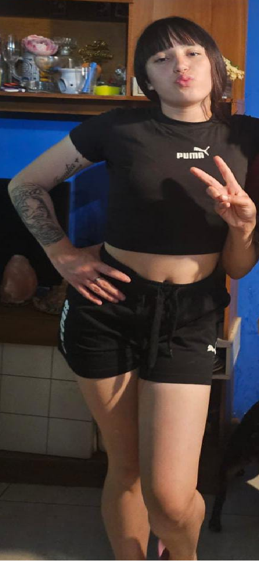 Tatuajes en ambos brazos, media manga de una muñeca, en una mano tatuaje que dice Yenifer y en la otra dice Itan. Detrás de la Oreja izquierda tatuaje de una flor y en el hombro tatuaje que dice Familia. Vestimenta: Short corto gris, Top azul y Chancletas rosadas.